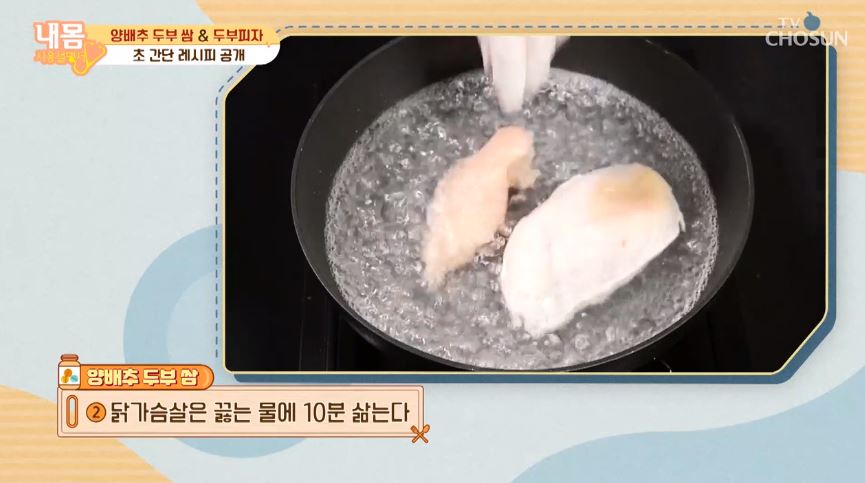 양배추는 깨끗하게 씻은 후 찜기에서 5분 정도 쪄주고, 닭가슴살은 끓는 물에 10분 정도 삶아줍니다.