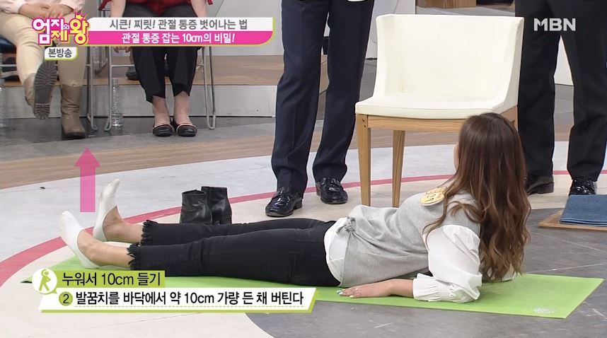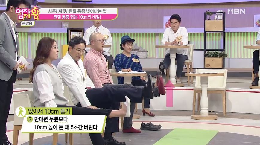 의자에 앉아서 한쪽 다리를 쭉폅니다. 그리고 반대편 다리를 무릎보다 10cm 높이든채로 5초간 버팁니다.