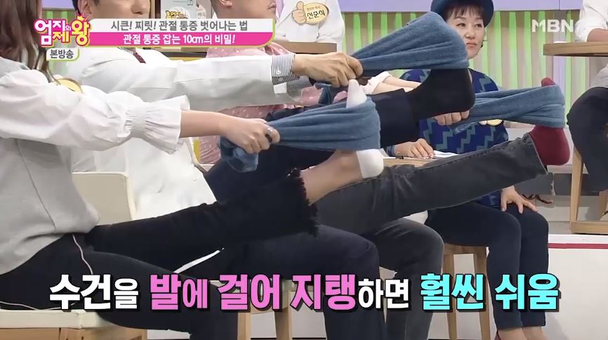 이런 동작이 어려운 분들도 계실텐데요. 이런 경우 수건을 발에 걸어 지탱하면 한결 쉽게 할 수 있습니다.