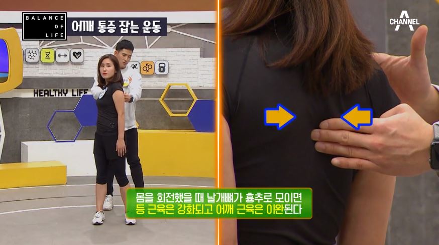 어깨를 회전시킬 때 날개뼈가 흉추로 모이게 되는데, 이때 등 근육이 강화되고 어깨 근육은 이완됩니다.