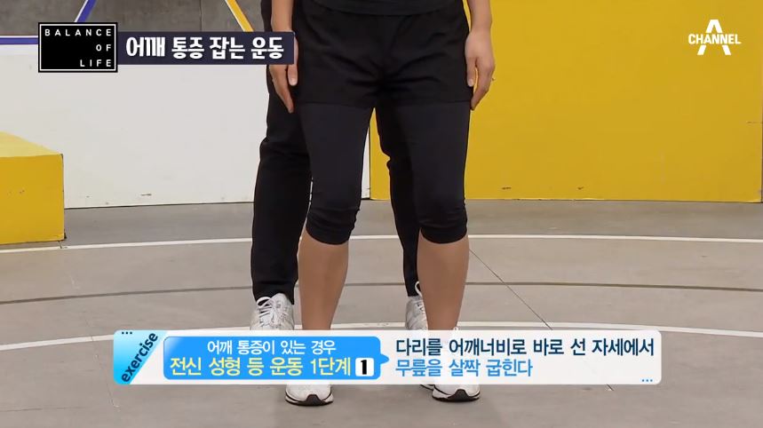 바로 선 자세에서 다리를 어깨너비만큼 벌립니다. 이 때 무릎은 살짝 굽힌 상태에서 시선은 정면을 응시한 채 어깨만 좌우로 회전시킵니다.