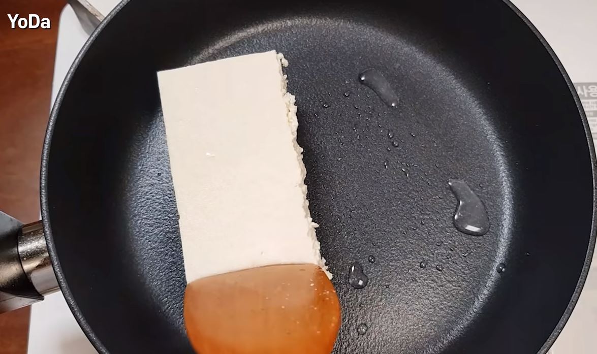 두부반모를 프라이팬 위에 올리고, 조각조각 으깨주세요. 다음은 두부의 수분을 날려줄 건데요. 가스렌지 센불에서 으깬두부를 볶으면 수분이 날아가게 됩니다.
