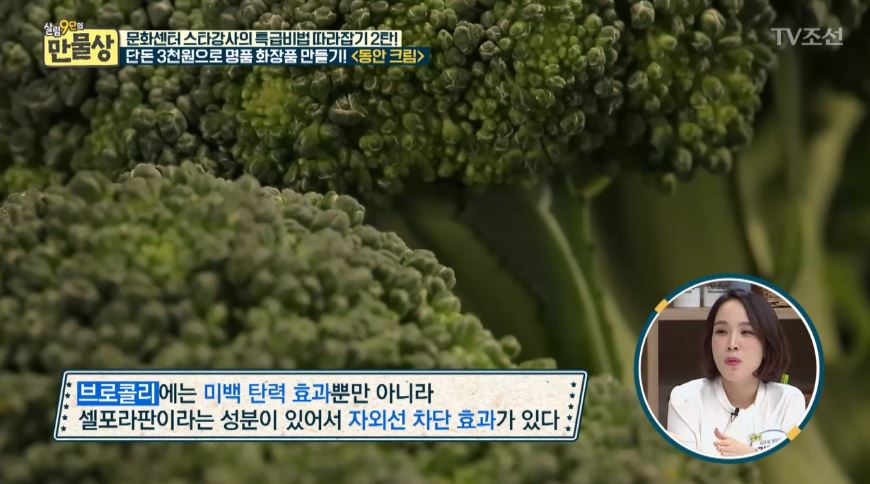 미백탄력효과에 좋다고 알려진 브로콜리에는 셀포라판이라는 성분도 들어 있는데요. 셀포라판의 대표적인 특징으로는 자연적인 자외선 차단 효과가 뛰어나다고 합니다. 사실 브로콜리가 슈퍼푸드라는 별명을 얻은 이유도 바로 셀포라판 성분이라고 하네요.