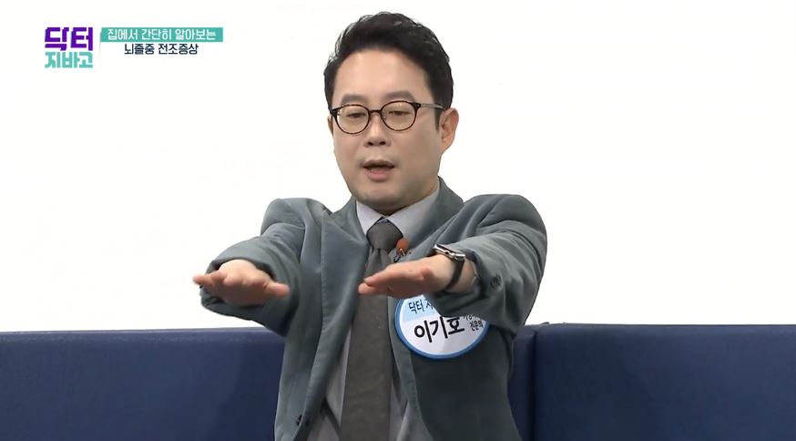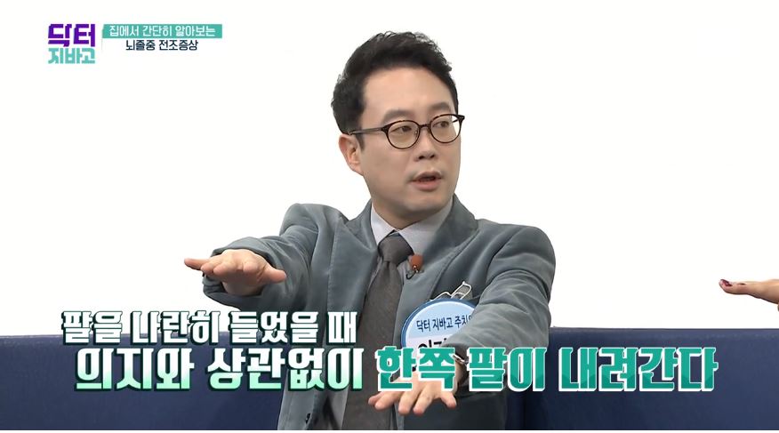 또한 팔을 앞으로 나란히 들었을때 의지와 상관없이 한쪽팔이 내려가는 경우에도 뇌졸중을 의심해볼 수 있습니다.
