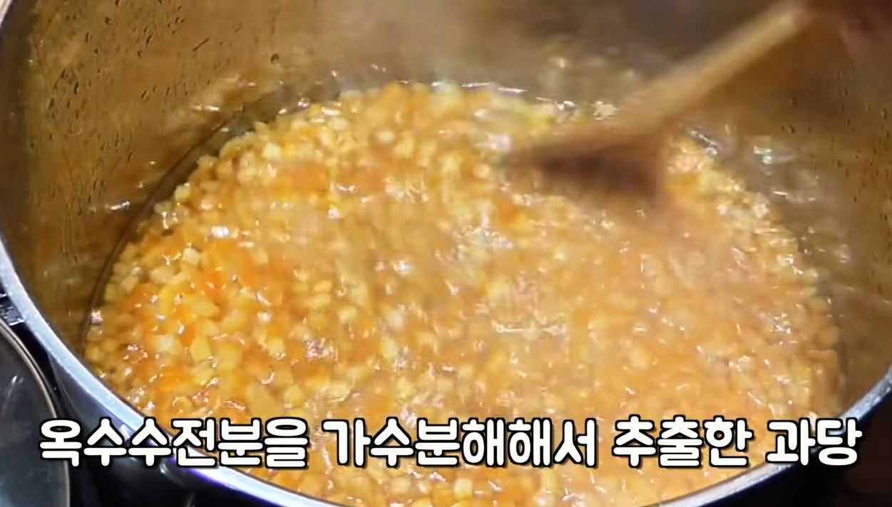 바로 옥수수 전분을 분해 해서 만든 HFCS (High Fructose Corn Syrup) 고과당 옥수수시럽인데요. 건강에는 조금 안좋은 성분인데요, 싸고 단맛을 많이 낼 수 있기 때문에 과자나 액상드링크에 많이 들어간다고 합니다.