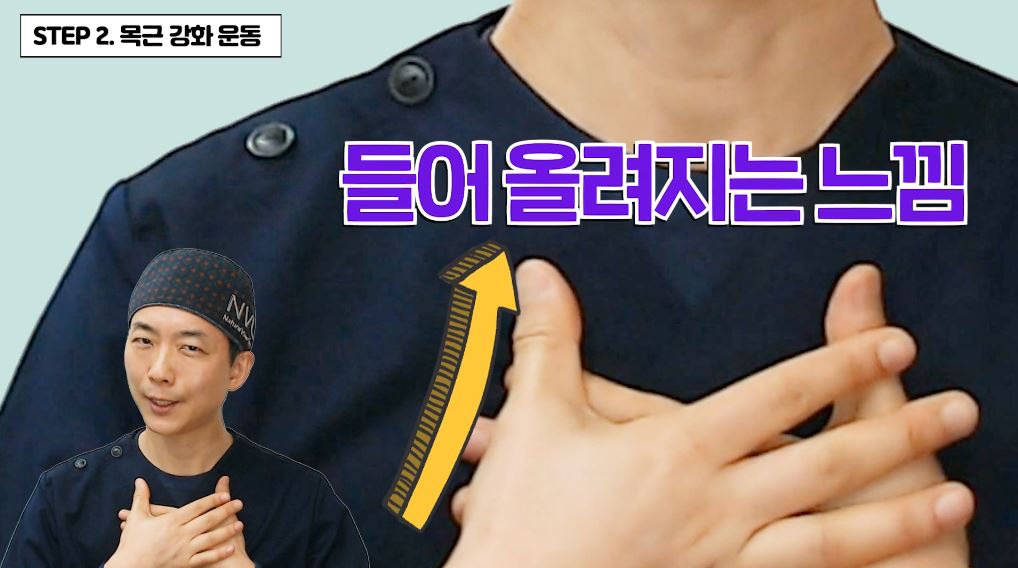 목근육이 강하게 당겨지는 걸 느낄 수 있을텐데요, 이때 윗가슴에 손을 대보세요. 가슴까지 들어 올려 주는 느낌이 들어야 제대로 하고 있는 겁니다.