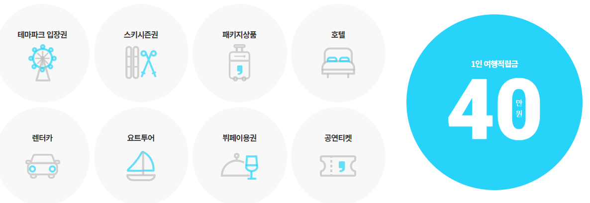 적립된 40만원을 온라인몰 '휴가샵'에서 숙박, 교통, 입장권, 여행패키지와 관련된 상품으로 구매할 수 있으며 유효기간은 12월 말일까지 입니다.