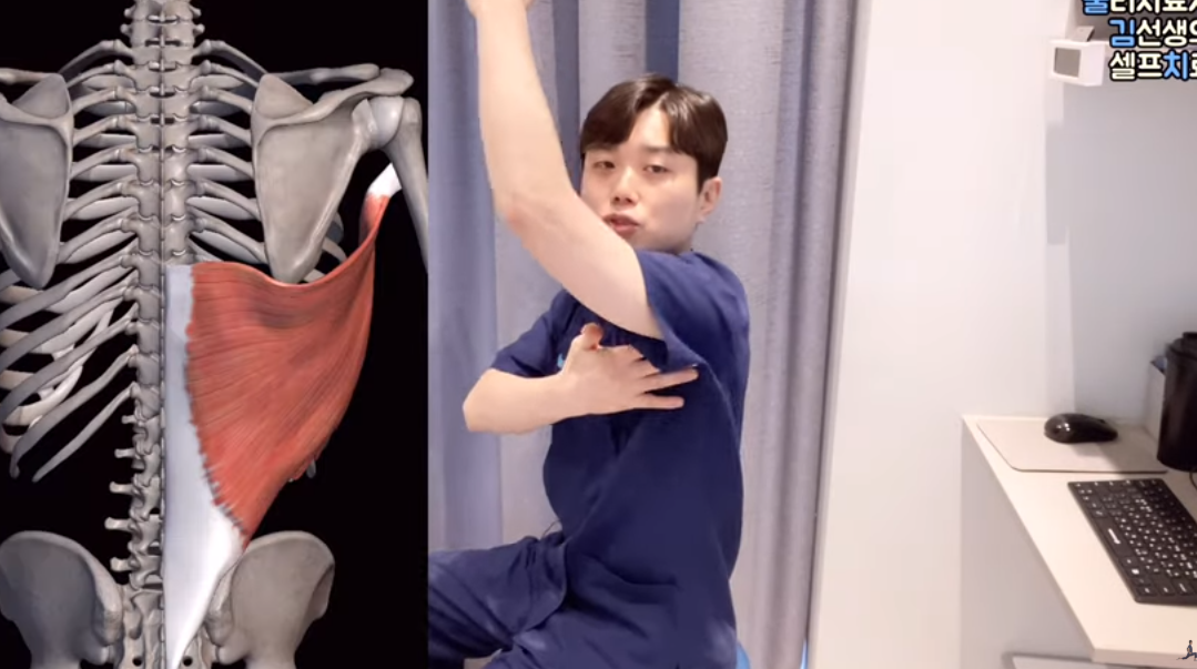 양쪽에 높이가 차이가 났을 때 조금 더 낮게 형성돼 있는 부위 쪽에 광배근을 스트레칭 해주면 됩니다.