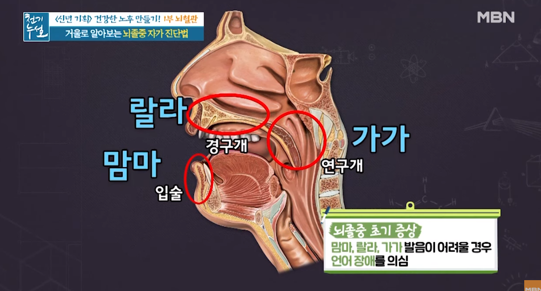 입술에서 나는 소리 '맘마' 경구개에서 나는 소리 '랄라' 연구개에서 나는 소리 '가가' 발음을 통해 마비가 온 부위까지 확인할 수 있습니다.