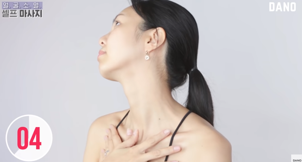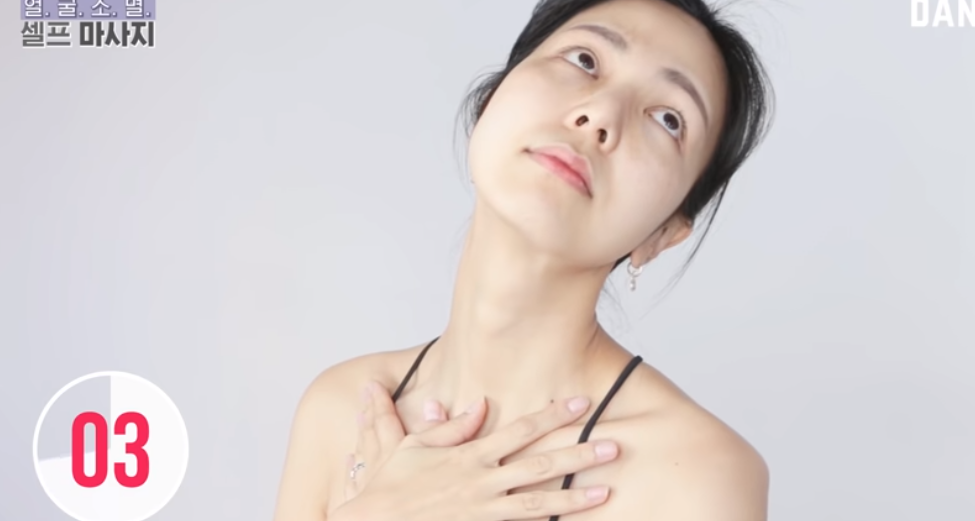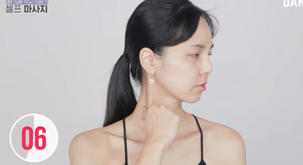 귀부터 쇄골라인까지 이어지는 흉쇄유돌근을 엄지와 검지를 사용해 꼬집듯이 내려가며 마사지 합니다.