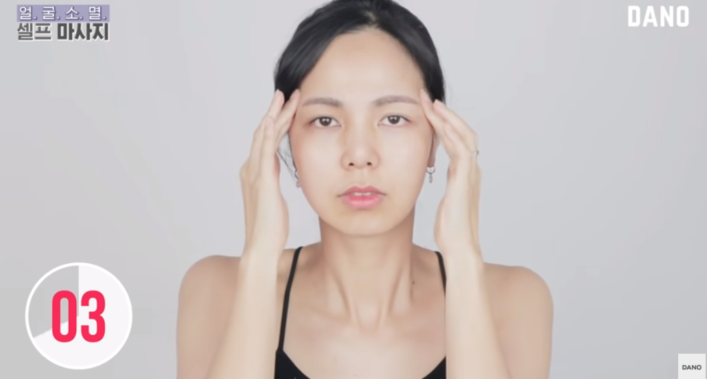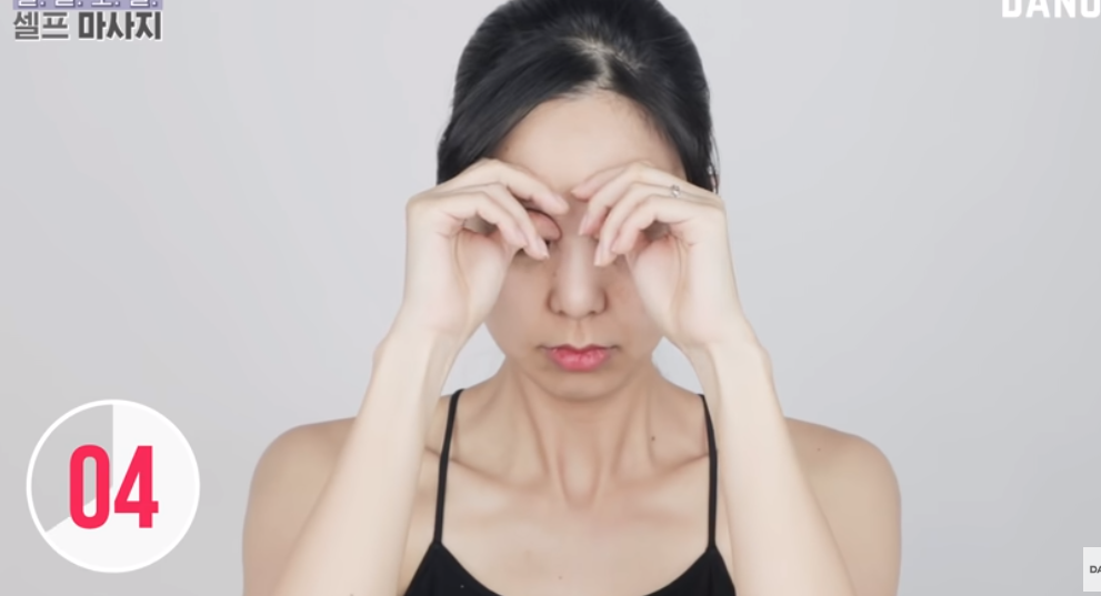 눈 옆게 움푹 들어간 관자놀이를 위에서 아래로 마사지 합니다.