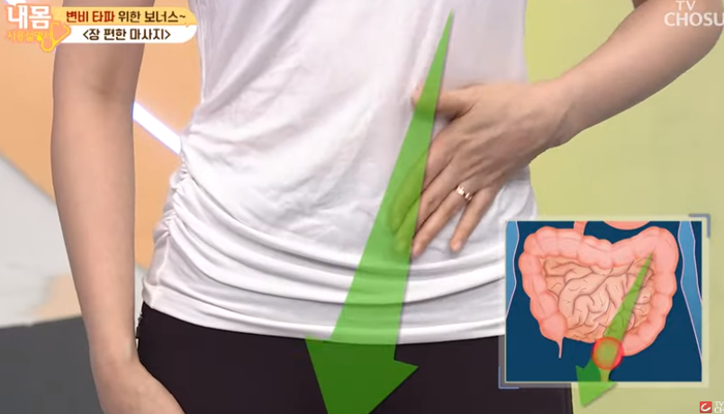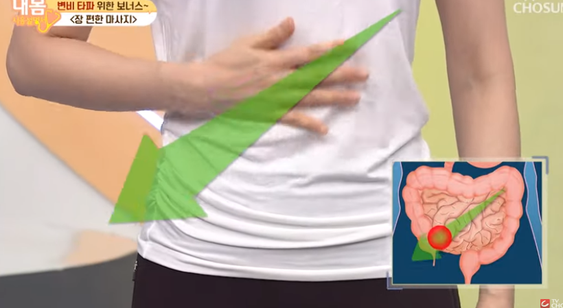 왼손으로 배꼽 위에서부터 항문이 있는 중앙을 향해 사선으로 문질러 줍니다.