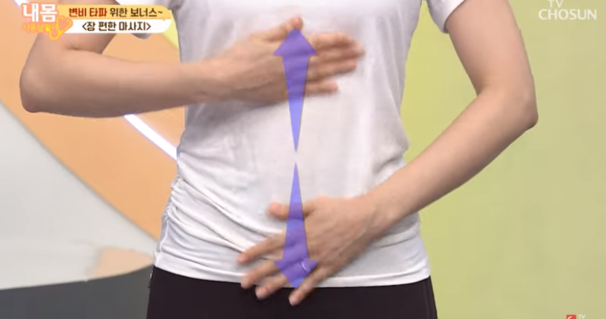 배꼽을 기준으로 한 손을 위쪽, 한 손은 아래쪽 양방향으로 동시에 살살 문지릅니다.