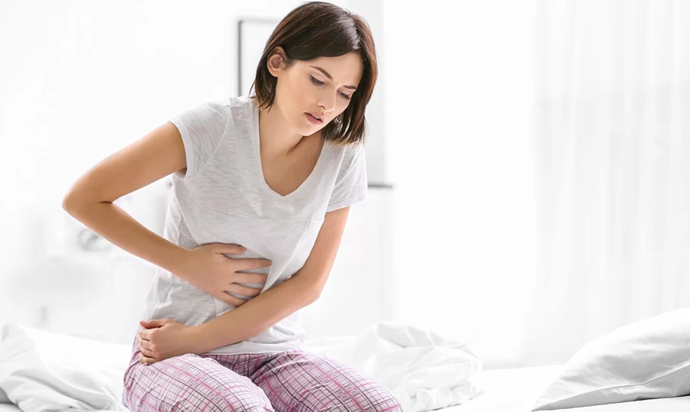 오른손으로 배꼽 위에서부터 오른쪽 골반 뼈를 향해 사선으로 문지릅니다.