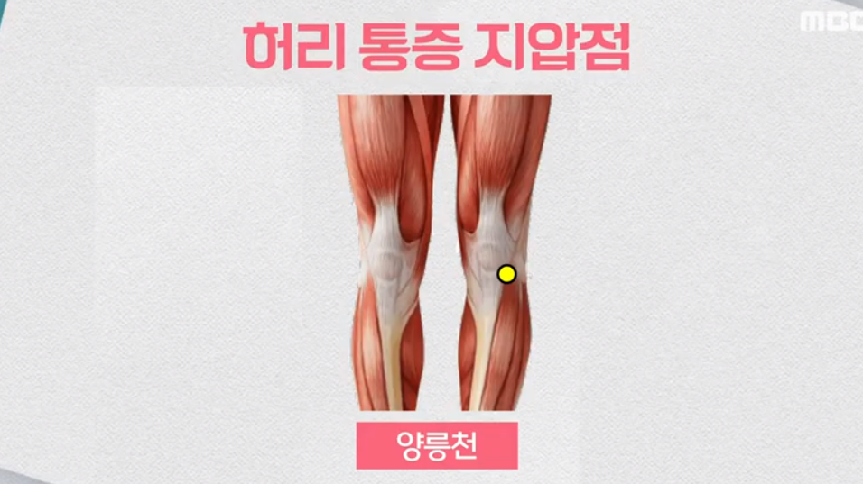 이 부분을 엄지손가락으로 지그시 눌러줍니다. 허리가 아프면 양쪽 무릎의 양릉천 혈 지압을 해주면 허리가 풀리게 됩니다.