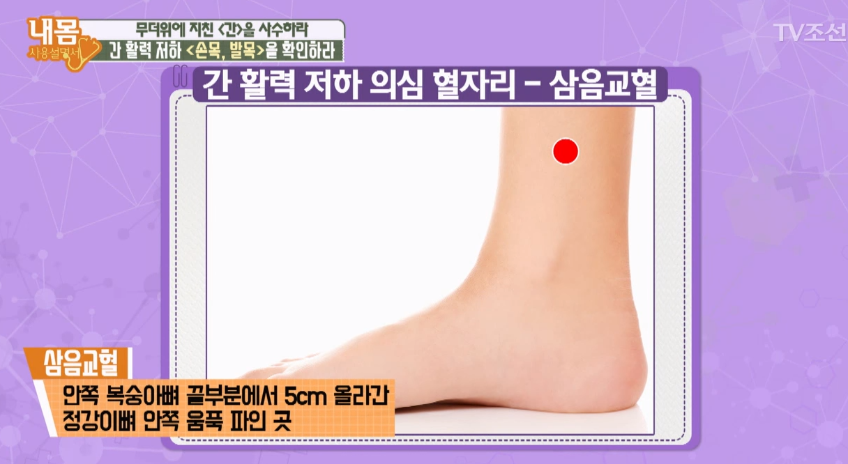 간 활력 저하 진단혈이자 혈액 순환을 돕는 혈자리 입니다.
