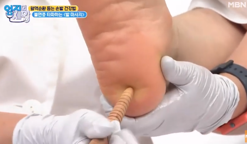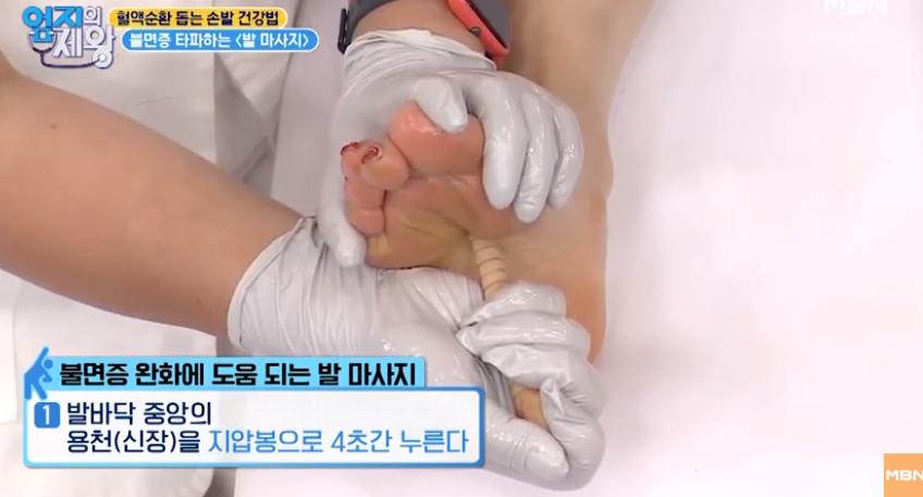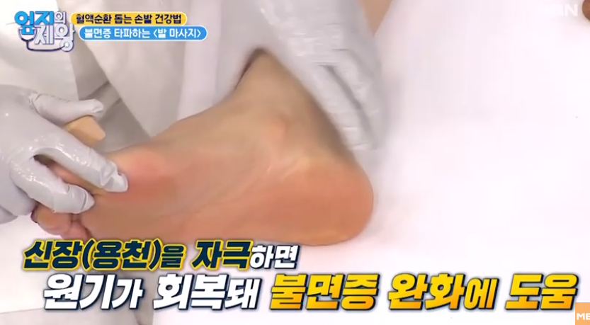 신장(용천)을 자극하면 원기가 회복되어 불면증 완화에 도움이 됩니다.