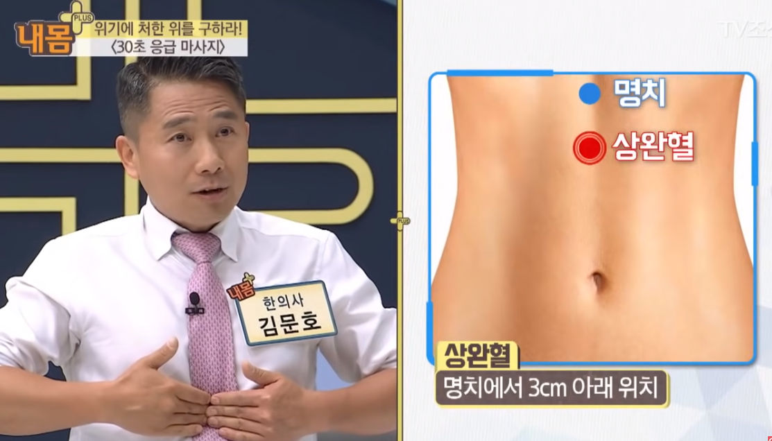 상완혈은 명치에서 3cm 아래 위치한 위장의 입구입니다.