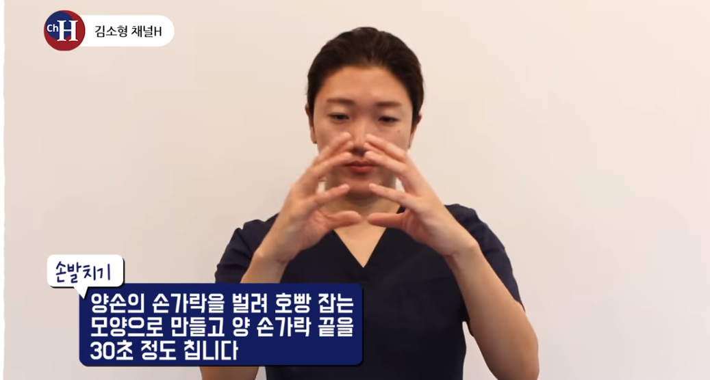 양손의 손가락을 벌려서 호빵 잡는 모양으로 만들어 양 손가락 끝을 30초 정도 쳐줍니다.