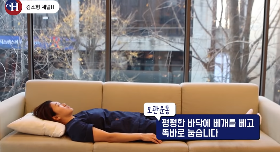 평평한 바닥에 베개를 베고 똑바로 눕습니다.