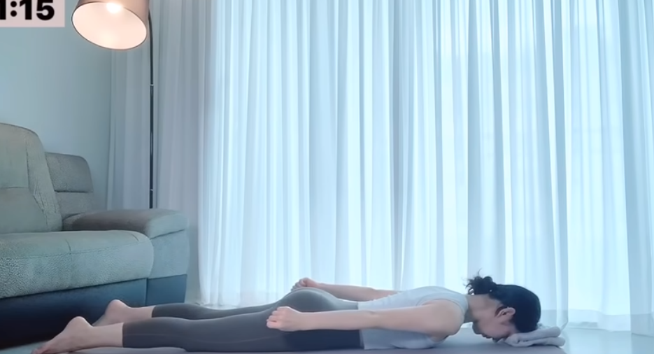 수건을 도톰하게 접어 매트 앞쪽에 깔고 이마를 수건 위에 놓습니다.