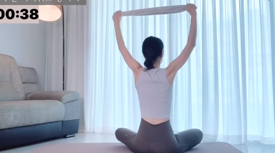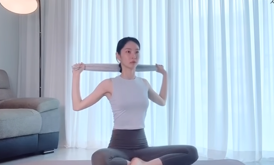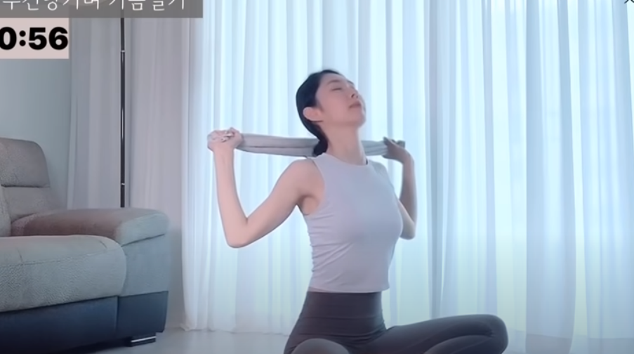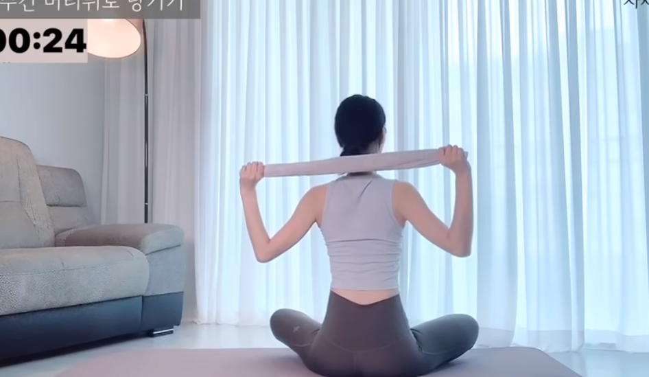 수건을 좌우로 당기면서 팔꿈치를 아래쪽으로 끌어 내리면 등과 겨드랑이 아래쪽 근육이 자극이 되면서 승모근의 긴장을 떨어뜨리고 쇄골을 좌우로 열어줄 수 있습니다.