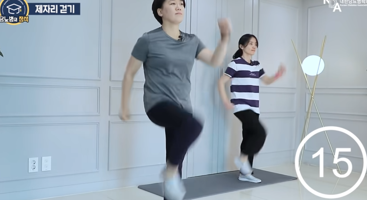 1세트 더 반복해주고 제자리 걷기로 마무리 합니다. 세트사이 휴식시간은 1분으로 해주세요.
