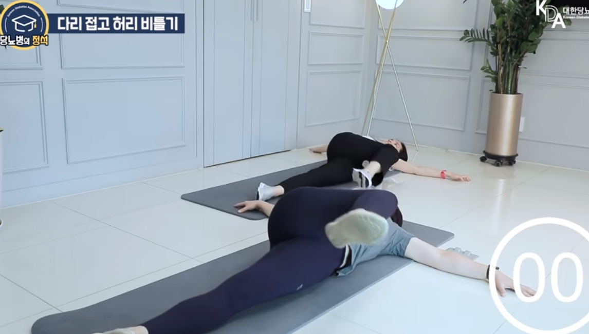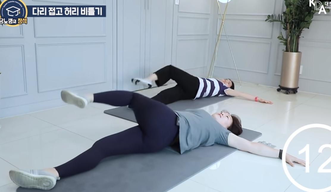 무릎이 반대쪽 바닥에 닿을 정도로 허리를 비틀었다 제자리로 돌아오기를 반복합니다.