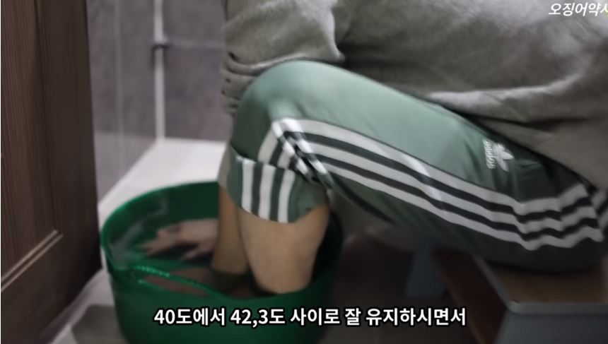 물을 받고 온도를 42도 정도로 유지하는 것이 좋습니다. 시간이 지나 온도가 40도 이하로 내려가면 효과가 떨어지므로 온도를 유지할 수 있게 물을 부어 줍니다.