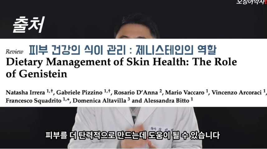 또한 콩 속의 주요 이소플라본 중 하나인 제니스테인의 경우 에스트로겐의 분비가 점점 줄어들어가는 장년층 여성들에게 에스트로겐 베타 리셉터와 결합하여 콜라겐 합성을 증진 시켜 피부 탄력에 도움이 됩니다.