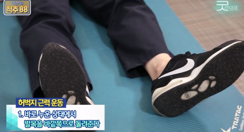 누운 상태에서 발목을 바깥쪽으로 돌려줍니다.