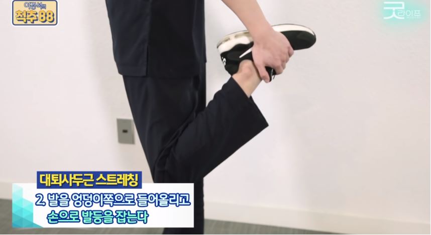 발뒤꿈치가 엉덩이에 닿도록 천천히 당겨줍니다.