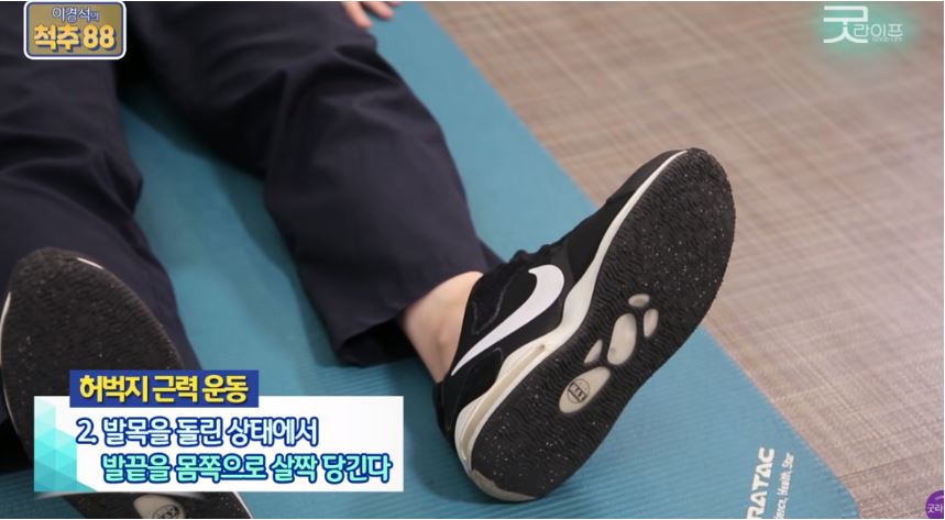 무릎을 펼 때는 발목도 몸쪽으로 당겨줍니다.