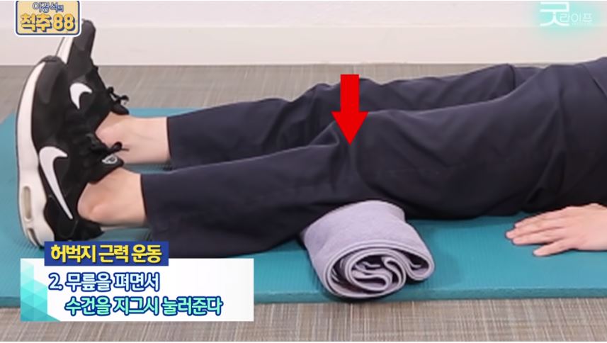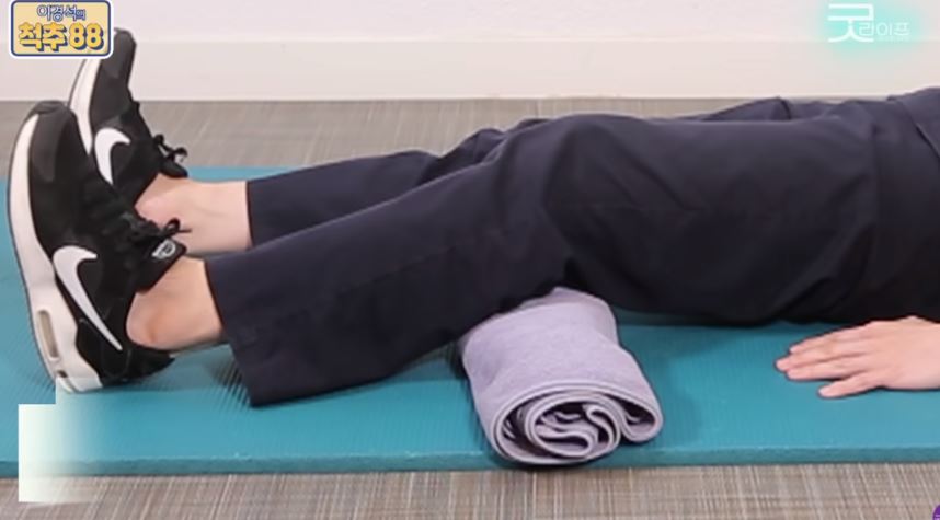 누운 상태에서 수건을 무릎 밑에 넣어 줍니다.