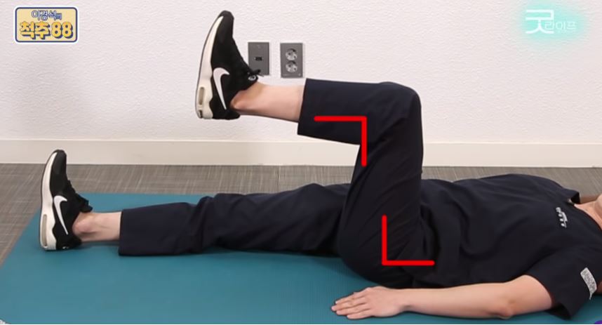 다리를 너무 높게 올리면 허리에 부담이 되므로 주의 합니다.
