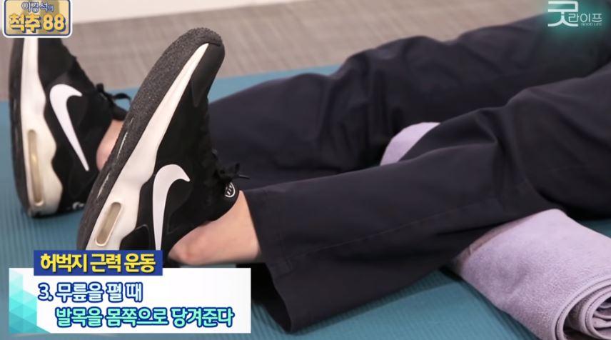 무릎을 펴고 수건을 눌러줍니다.