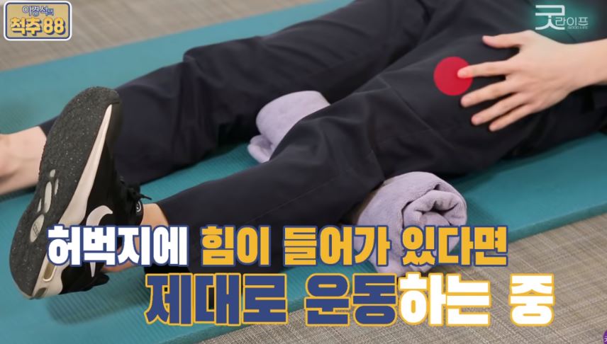 누운 상태에서 수건을 무릎 밑에 넣어 줍니다.