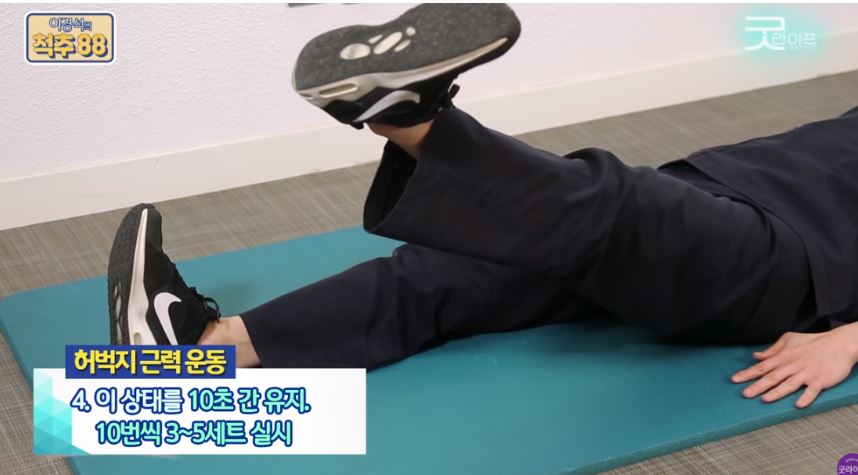 10초 간 자세를 유지하고 10번씩 5세트씩 진행합니다.(반대쪽 동일하게 진행)