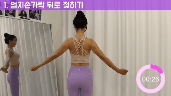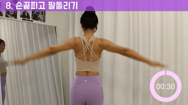 가슴 근육 늘리며 양팔을 뒤로 보냅니다.