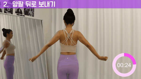 가슴 근육 늘리며 양팔을 뒤로 보냅니다.