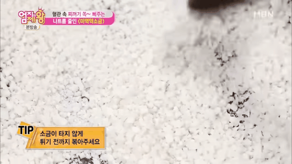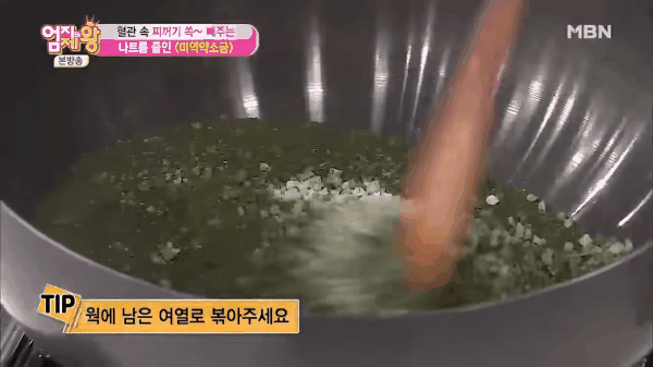3. 간 미역을 볶은 소금에 넣고 볶습니다.