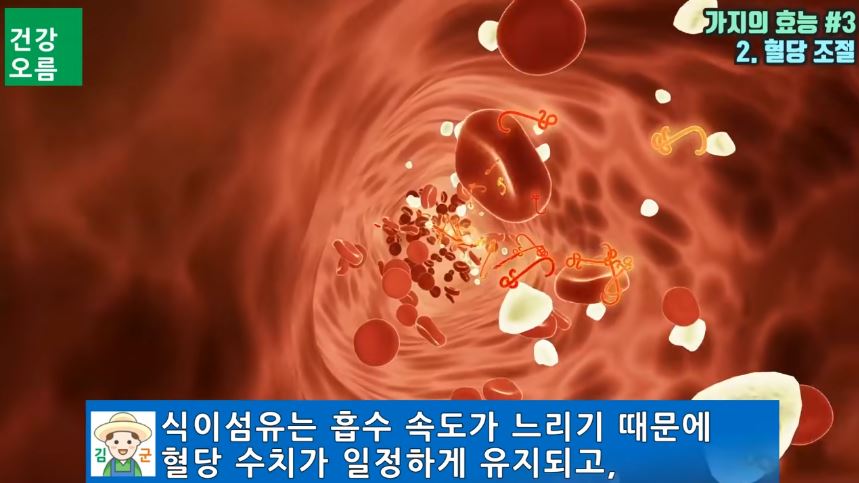 가지의 풍부한 식이섬유는 체내에서 설탕을 소화율과 흡수속도를 늦춰주는 역할을 합니다. 이러한 작용들은 혈당을 낮추는데 많은 도움이 되는데요.