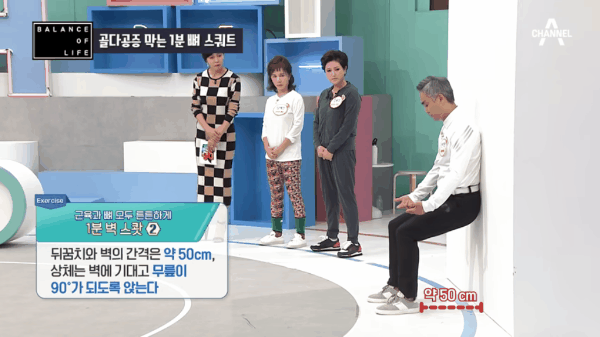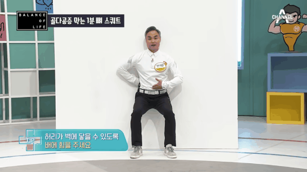하루 1분이면 돌처럼 단단한 허벅지를 만들어 주는데요, 벽에 기대어 투명의자 앉듯이 자세를 취하고 1분 동안 버티는 운동입니다.