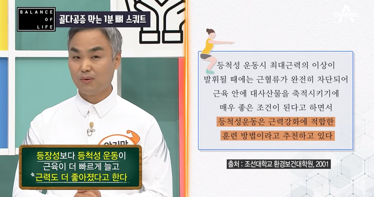 무릎 관절은 안 움직이면서 근육만 강화되는 운동으로 몸에 무리가 가지 않으면서 골다공증 예방에 좋습니다.