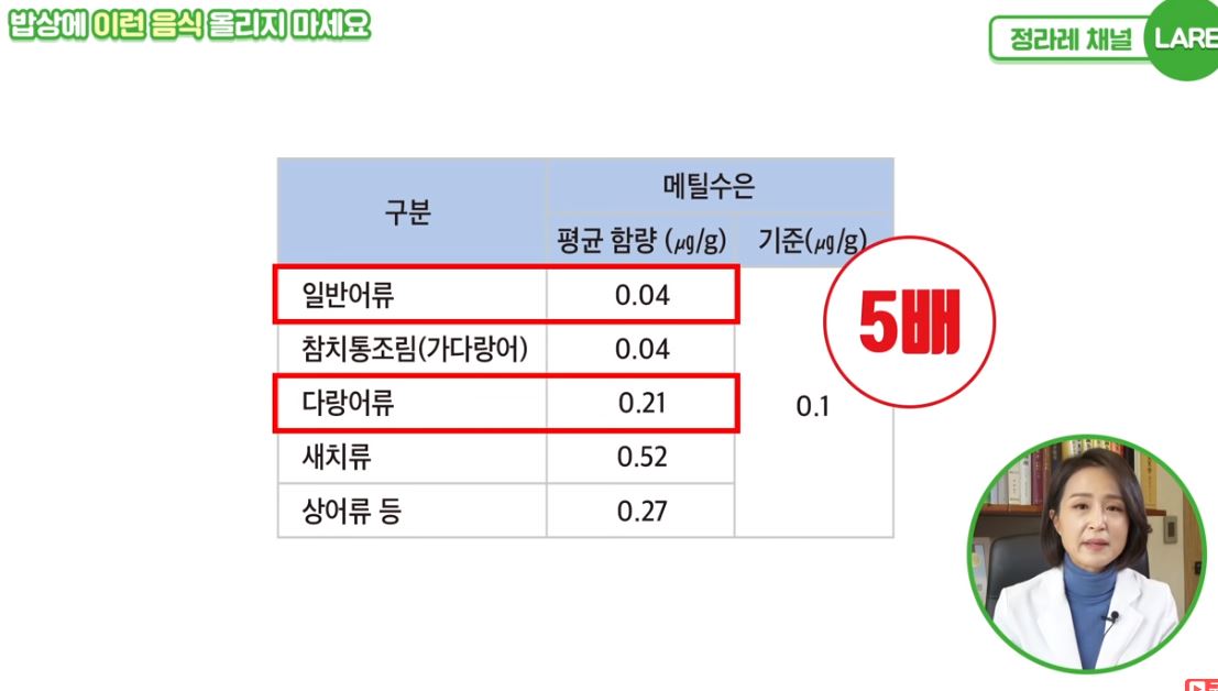 고등어나 조개 같은 일반어류의 경우 메틸수은 함량이 0.04㎍에 비해 참치회로 많이 먹는 다랑어류는 0.21㎍로 5배나 높습니다.