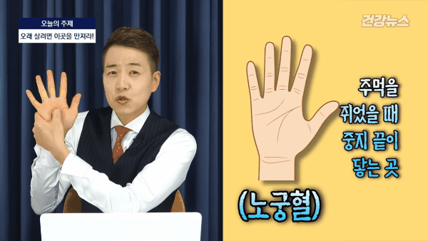 스트레스 받을 때 노궁혈을 5초간 눌렀다 떼어주는 것을 반복해주면 정신적인 피로와 함께 스트레스를 해소하는데 효과를 볼 수 있습니다.