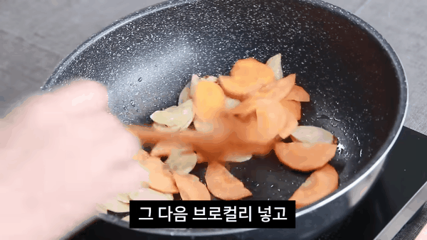 당근과 우엉을 먼저 볶다가 브로컬리, 가지순으로 넣어 볶습니다.