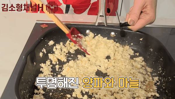수분이 날아가면 다진 마늘, 다진 양파를 넣고 투명해질때까지 약불에서 볶는다
