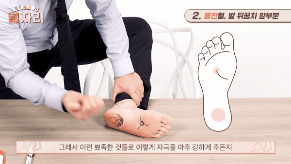 발 전체를 두드릴 때 용천과 발 뒤꿈치 바로 앞부분을 같이 두드려주면 굉장히 효과가 좋습니다.
