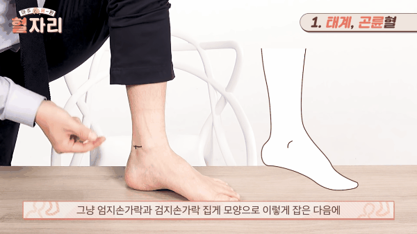 태계는 신경, 우리 몸의 신장을 강화시켜주는 혈자리인데 이 부분과 더불어서 바깥쪽 뒤로 아킬레스건 안쪽 부분은 곤륜이라는 혈자리입니다.